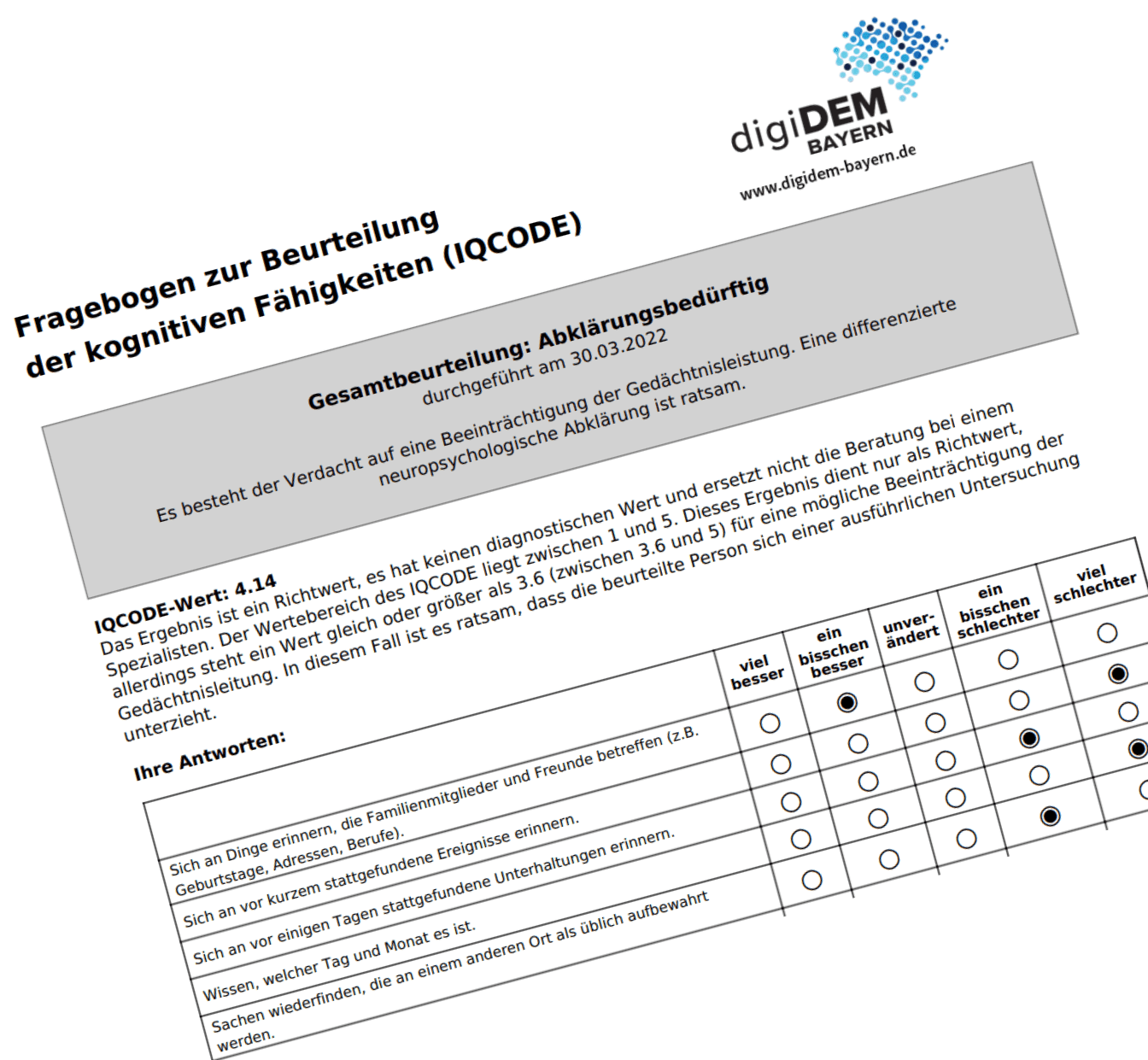 Der Online-Fragebogen von digiDEM Bayern ist ein erster Schritt hin zu einer weiterführenden Diagnostik bei Menschen mit Demenz. Er lässt sich am PC oder Smartphone ausfüllen und ist in fünf Sprachen verfügbar.